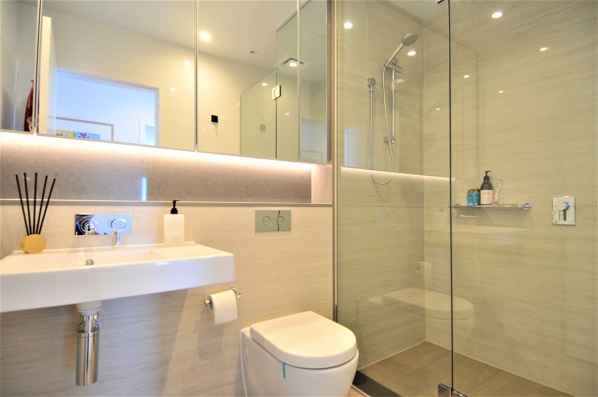 - Tiled bathrooms with shower stand and mirrored joinery cupboards (ensuite with bath tub)